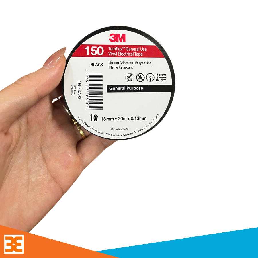 Băng keo điện 3M Temflex 150 là dòng băng keo chuyên dụng của 3M, được thiết kế để cách điện, bảo vệ mối nối dây điện và ngăn cháy lan trong các ứng dụng điện hạ thế. Sản phẩm phiên bản màu đen, kích thước 18mm rộng x 20m dài x độ dày ~0,13mm phù hợp với việc quấn dây, cáp và các mối nối điện trong gia đình, công nghiệp nhẹ. Theo thông tin từ nhà phân phối, sản phẩm đáp ứng tiêu chuẩn RoHS và hoạt động ở nhiệt độ từ 0 °C đến 80 °C.