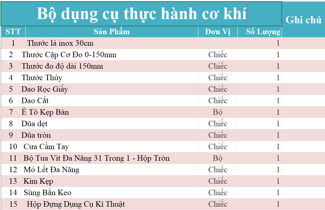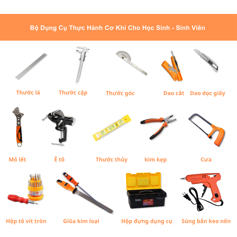 Bộ dụng cụ thực hành cơ khí là dụng cụ được thiết kế nhằm giúp học sinh, sinh viên nắm vững các kiến thức lý thuyết và kỹ năng thực hành về cơ khí. Bộ dụng cụ bao gồm những công cụ cơ bản nhất để thực hiện các bài thực hành thao tác kỹ thuật. Việc sử dụng bộ dụng cụ sẽ giúp các em hiểu rõ hơn về kỹ thuật cơ khí thông qua trải nghiệm thực tế.