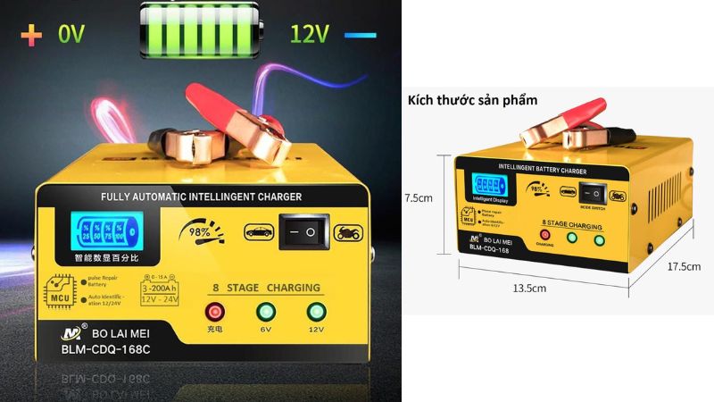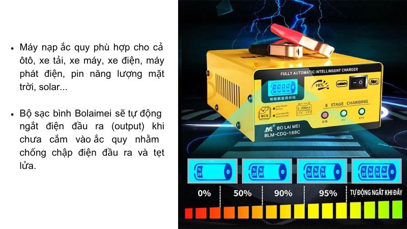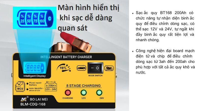 Sạc ắc quy Bolaimei BT168 là một bộ sạc thông minh, đa năng, phù hợp cho nhiều loại ắc quy từ xe máy đến ô tô, với khả năng sạc cả ắc quy 12V và 24V, dung lượng từ 3Ah đến 200Ah. Sản phẩm này mang đến sự tiện lợi và an toàn tối đa cho người dùng nhờ các tính năng vượt trội: