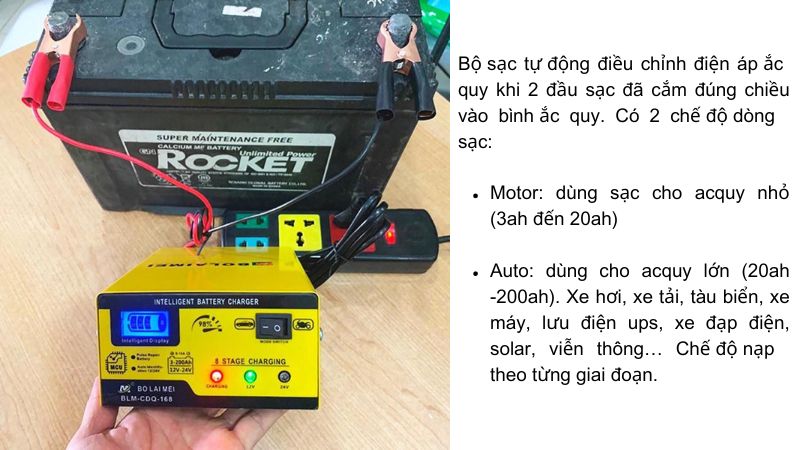Sạc bình ắc quy với thiết bị sạc Bolaimei BT168 theo trình tự các bước sau:
