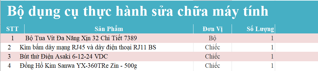 Bộ sản phẩm thực hành sửa chữa máy tính cho học sinh, sinh viên là giải pháp hoàn hảo giúp các bạn trẻ đam mê công nghệ thực hành và trau dồi kỹ năng sửa chữa máy tính một cách bài bản và hiệu quả. Bộ sản phẩm bao gồm đầy đủ các dụng cụ và linh kiện cần thiết để thực hiện các thao tác cơ bản trong công việc sửa chữa máy tính.