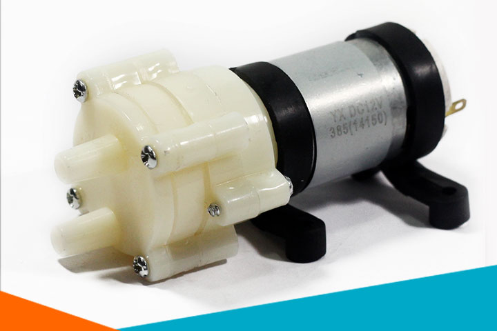 Bộ máy bơm mini RS385 12VDC + nguồn 12V-1A dùng chế tạo máy bơm sử dụng cho hòn non bộ với dòng đẩy lên đến 3m, lưu lượng 1.5 - 2 lít/ phút, có tuổi thọ 2500h, nhiệt độ nước lên đến 80 độ C.
