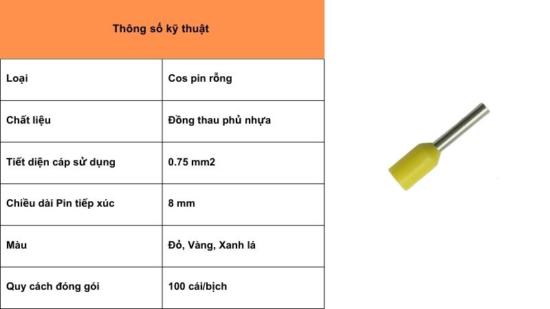 Đầu cos pin rỗng E7508 là một phụ kiện điện quan trọng, được sử dụng rộng rãi trong các công việc lắp đặt, sửa chữa điện. Sản phẩm có thiết kế nhỏ gọn, tiện dụng, được làm từ chất liệu đồng thau phủ nhựa, đảm bảo độ bền và khả năng dẫn điện tốt.