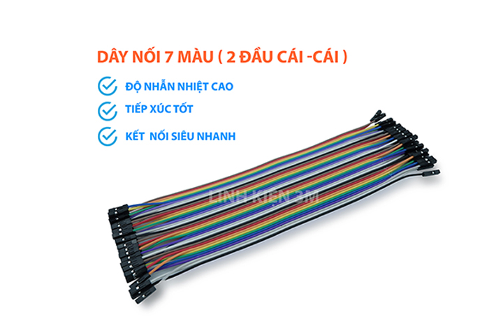 Dây nối 7 màu được sử dụng để kết nối test board, kết nối cảm biến, module thông dụng thực hành Arduino, Raspberry Pi, Micro bit,... Dây nối có 2 đầu lõi đồng nhiều sợi có độ dẫn điện cao, mối tiếp xúc chắc chắn và nhiều màu sắc khác nhau.