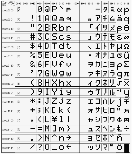 Dưới đây là bảng ký tự đặc biệt đã được nhà sản xuất thiết kế sẵn cho một số màn hình LCD phổ biến trên thị trường: