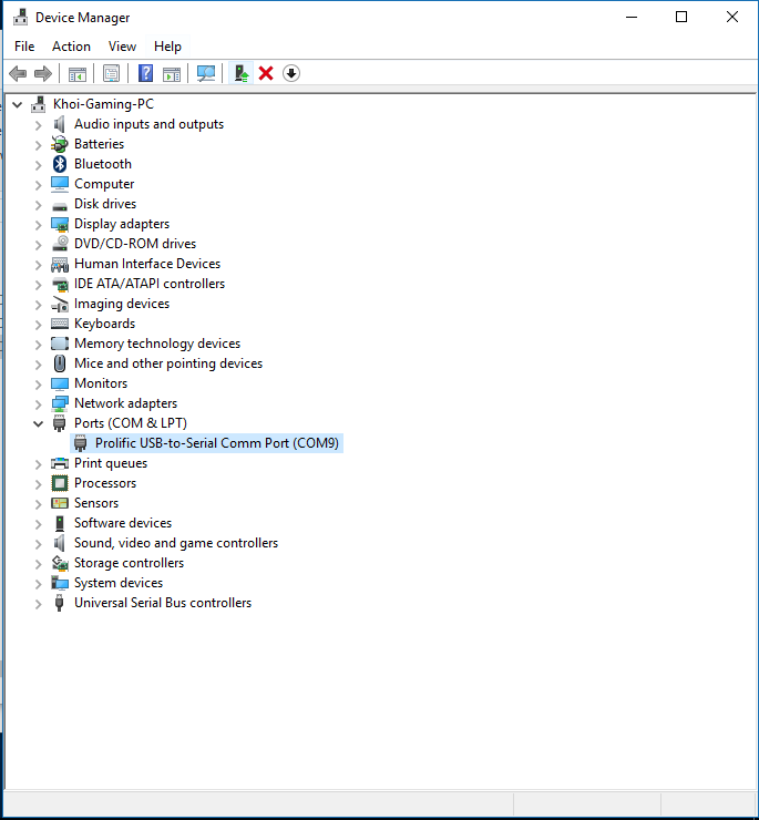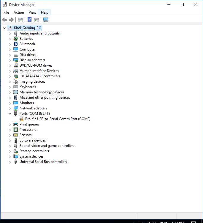 Lúc này các bạn sẽ thấy máy tính đã nhận module PL2303 tuy nhiên chưa có driver nên sẽ có dấu chấm than màu vàng.