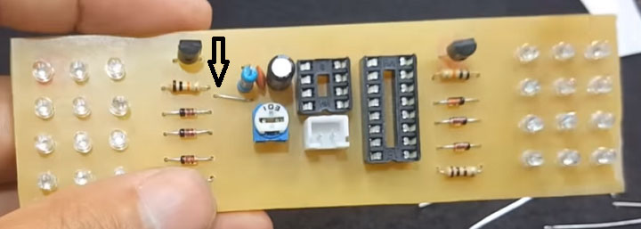 Bước 11: Cắm và hàn các linh kiên còn lại vào mạch: 2 transistor C1815, 16 điot, 2 trở 100 ôm, 2 trở 10 ôm. Tụ hóa 1uF, biến trở tam giác 10K, tụ gốm 104, đế IC như trong sơ đồ.