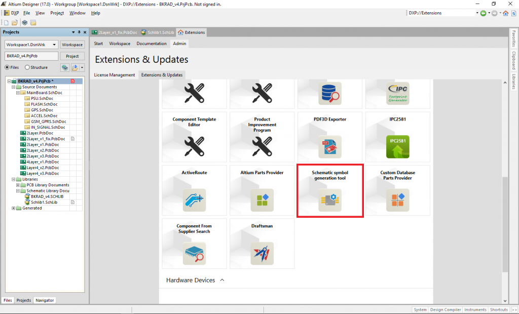 Đầu tiên các bạn muốn tạo thư viện nguyên lý bằng công cụ các bạn hãy tải công cụ trên Extensions của Altium :