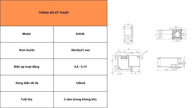 - Kích thước: 55x32x21mm. Module có kích thước nhỏ gọn, dễ dàng tích hợp vào các thiết bị hoặc hệ thống giám sát chất lượng không khí.