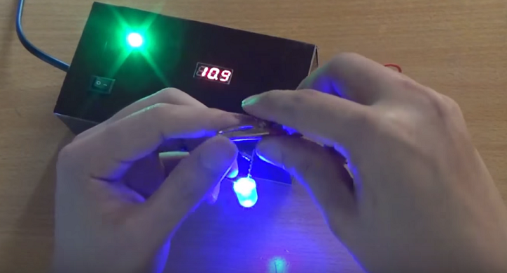 Bước 11 : Hàn trở 680 Ω vào chân dương của leb báo và hàn vào chân dương của cầu điot . Hàn chân âm của led báo vào cực âm của cầu điot.