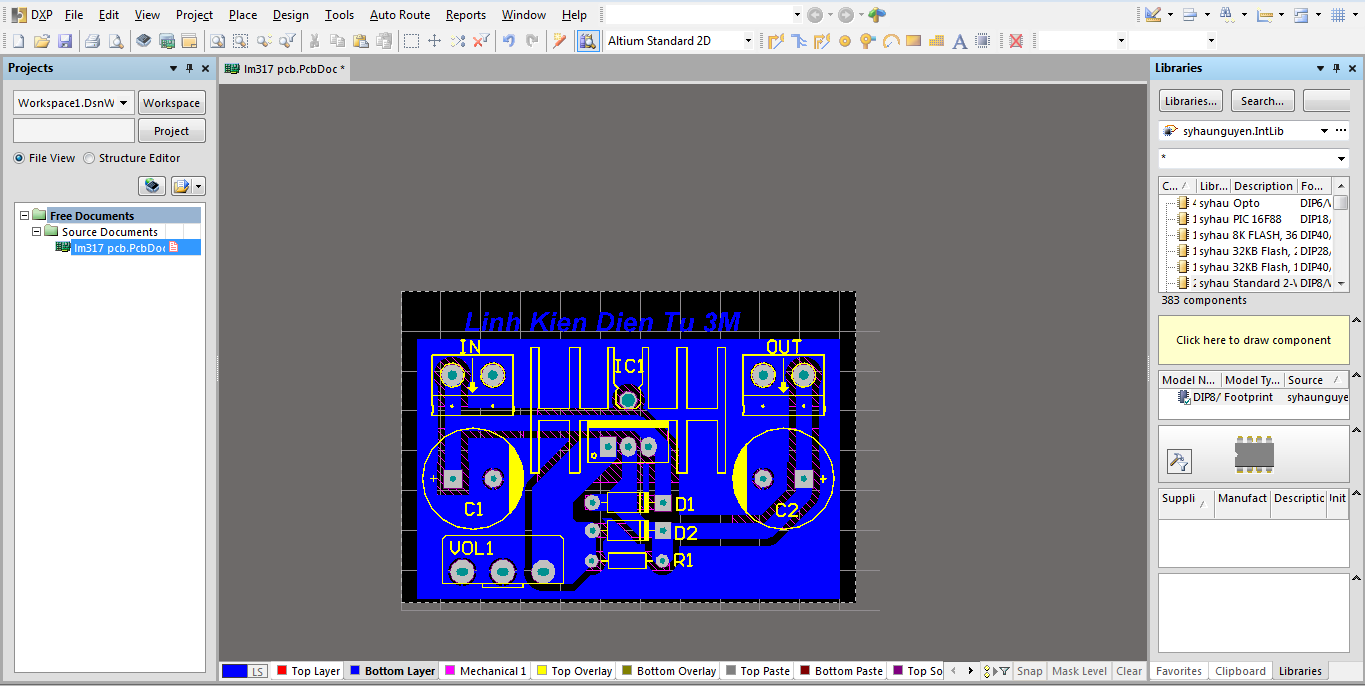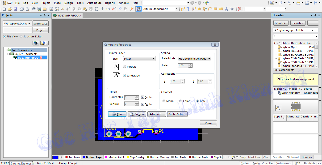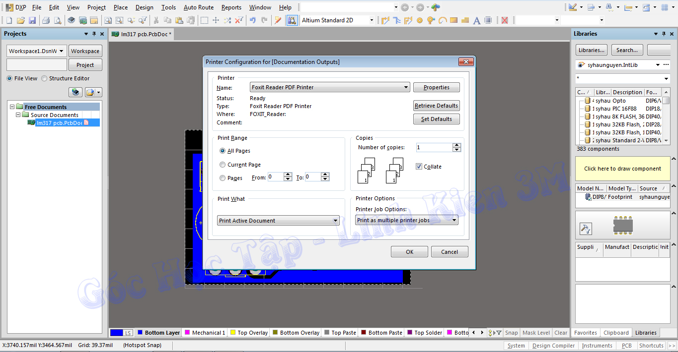 Chào tất cả các bạn, có lẽ Phần Mềm Altium đã quá quen thuộc với những bạn đã và đang thiết kế mạch rồi, nhưng có lẽ sẽ là rất mới với các bạn nào mới bắt đầu học và tự tìm hiểu. Hôm nay tôi sẽ hướng dẫn cho các bạn cách xuất File Mạch in từ PCB ra File PDF để dễ dàng in mạch lên giấy và làm mạch thủ công.
