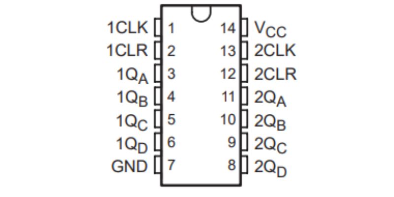 IC 74HC393 DIP-14 là một mạch tích hợp số thuộc họ CMOS, được sử dụng rộng rãi trong các hệ thống điện tử kỹ thuật số, là một bộ đếm nhị phân 4 bit kép, có nghĩa là nó bao gồm hai bộ đếm 4 bit độc lập trong cùng một gói IC, cung cấp mạch đếm MOD-2 (2 trạng thái đếm) và mạch đếm MOD-5 (5 trạng thái đếm).