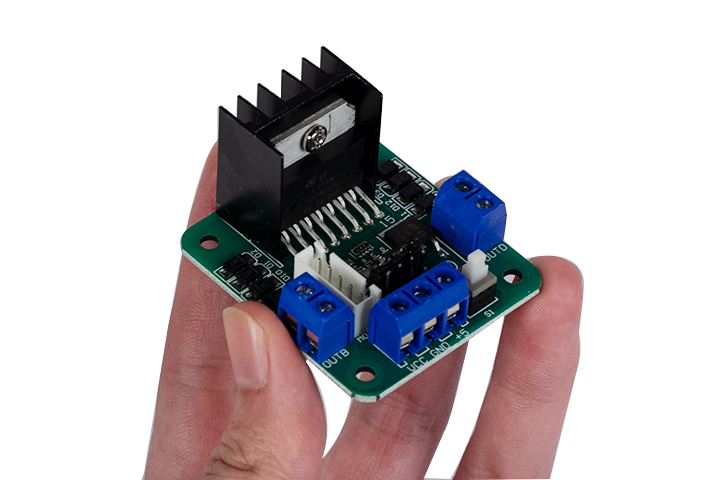 Module điều khiển động cơ L298 được tích hợp 2 mạch cầu H, có khả năng điều khiển 2 động cơ DC và 1 động cơ bước. Dòng ra tối đa 2A và nguồn cấp có thể từ 5 đến 35V. Động cơ A được điều khiển bằng cách cấp các mức điện áp 1 và 0 vào 2 chân IN1 IN2 . Tương tự động B được điều khiển bằng cách cấp mức 1, 0 vào IN3 IN4. Đảo các mức 1 , 0 này sẽ làm động cơ đảo chiều và có thể điều khiển tốc độ động cơ bằng cách cấp xung trực tiếp vào các chân IN. Chân Enable còn có tác dụng “phanh” gấp động cơ. Khi đưa chân Enable tương ứng với động cơ xuống mức 0.