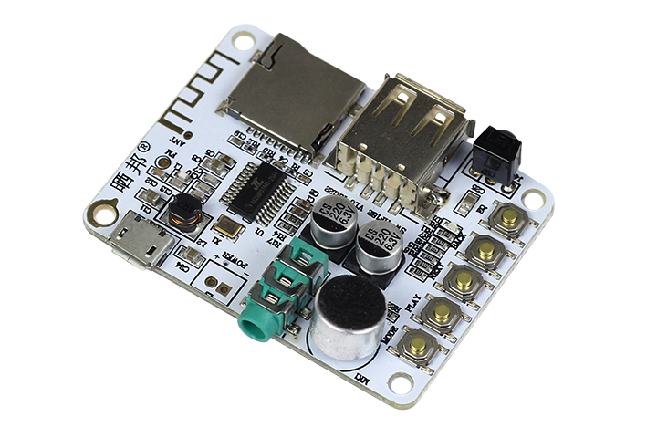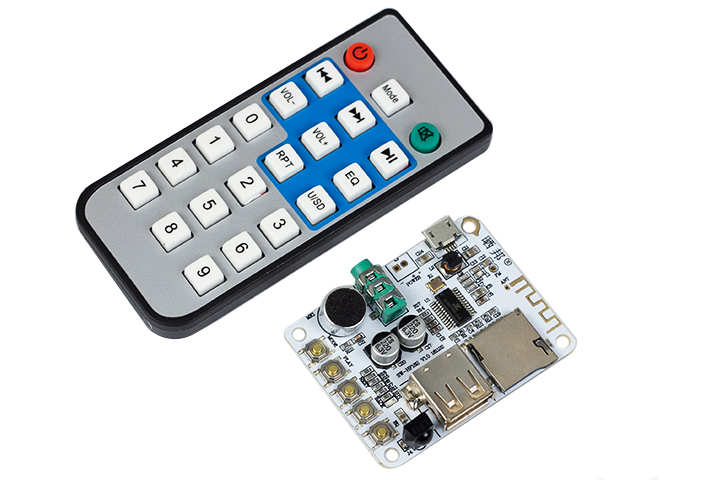Mạch Giải Mã Âm Thanh Bluetooth Kèm Remote có chức năng giải mã tín hiệu âm thanh được phát từ bluetooth, ngoài ra mạch còn tích hợp. Module khuếch đại hỗ trợ đọc thẻ nhớ, bắt sóng FM, đọc được file âm thanh từ USB.