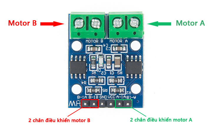 Chú ý: L9110 cho phép dòng khiển liên tục lên đến 800mA, tuy nhiên vì không có giải nhiệt cho IC nên chỉ thích hợp dùng với tải công suất thấp. Nếu cấp dòng quá lớn qua nó liên tục, IC bắt đầu nóng lên và có thể cháy. Module hoạt động ở nhiệt độ tối đa là 80 độ C.