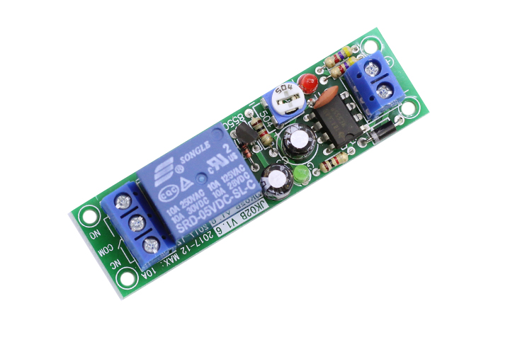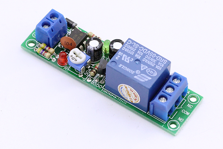 Module tạo trễ NE555 được sử dụng để điều chỉnh thời gian bằng biến trở delay từ 0- 60 giây, tăng giá trị biến trở hoặc điện dung c1 để tăng thời gian trễ, có đèn báo nguồn, 10A 250V AC hoặc 10A 30V DC.