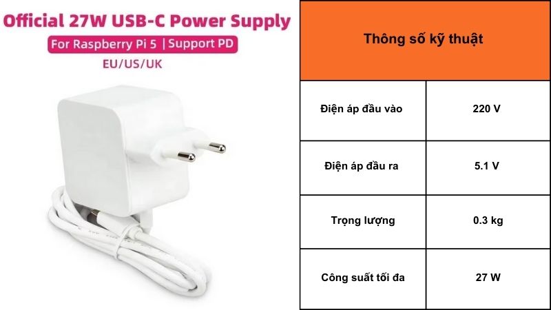 Nguồn điện Raspberry Pi 5, với công suất 27W và dòng điện 5A, cung cấp năng lượng dồi dào và ổn định cho mọi hoạt động của bo mạch. Thiết kế tối ưu giúp nguồn điện hoạt động hiệu quả, kéo dài tuổi thọ cho Raspberry Pi 5. Đây là lựa chọn hoàn hảo cho những ai đang tìm kiếm một nguồn điện đáng tin cậy và mạnh mẽ để phục vụ các dự án của mình.