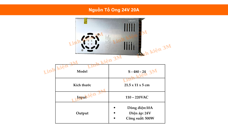Nguồn Tổ Ong 24V 20A hay còn gọi là bộ nguồn một chiều được thiết kế để chuyển đổi điện áp từ nguồn xoay chiều 220VAC thành nguồn một chiều 24VDC để cung cấp cho các thiết bị hoạt động. Nguồn tổ ong được sử dụng rộng rãi trong các thiết bị điện và dân dụng. Trong công nghiệp chúng thường được sử dụng để cấp nguồn cho một số thiết bị của tủ điện,...