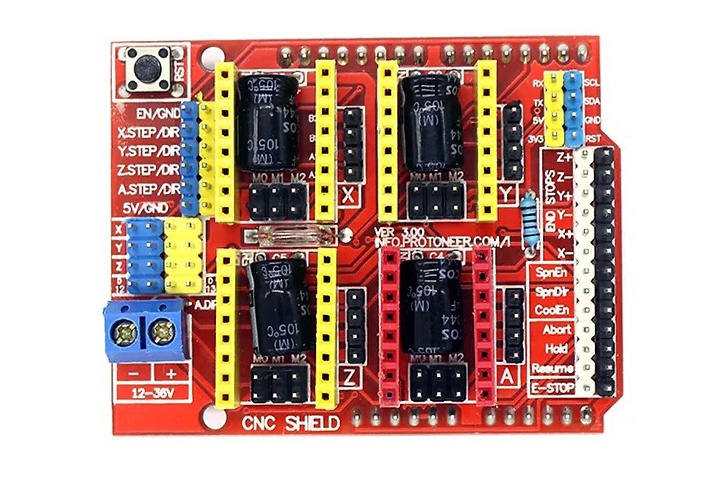 Arduino Cnc shield 3D tương thích với GRBL, hỗ trợ lên tới 4 trục( trục X, Y, Z và một trục thứ tư tùy chọn), hỗ trợ tới 2 Endstop ( cảm biến đầu cuối) cho mỗi trục, tính năng điều khiển spindle. Sử dụng các mocule điều khiển động cơ bước, giúp tiết kiệm chi phí khi thay thế, nâng cấp.