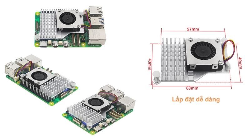 - Tản nhiệt nhôm nguyên khối & Quạt PWM: Tản nhiệt nhôm lớn kết hợp cùng quạt PWM thông minh giúp kiểm soát nhiệt độ hiệu quả, đặc biệt trong các tác vụ đòi hỏi hiệu suất cao, đảm bảo Raspberry Pi 5 luôn hoạt động ổn định.