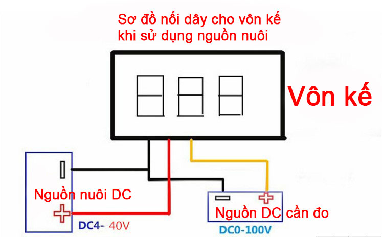 Lưu ý: Khi cấp nguồn riêng cho vôn kế điện tử từ 4-40V thì vôn kế có thể đo được dải điện áp từ 0-100V